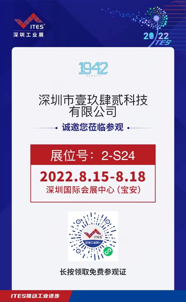 2022年ITES深圳國際工業(yè)制造技術(shù)展覽會將于2022年8月15日在深圳國際會展中心(寶安新館)盛大開幕,smt貼片加工廠|深圳市壹玖肆貳科技有限公司|再次亮相2022年ITES深圳工業(yè)展,在此我們真誠的邀請您蒞臨2-S24展位參觀指導(dǎo),我們期待與您相遇。