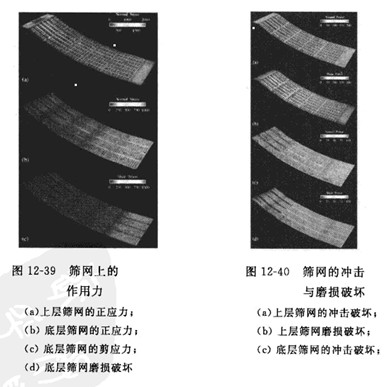 振動篩篩分的DEM仿真結果可以用于分析顆粒群再篩網(wǎng)上的松散度、振動強度、料層厚度、篩孔孔徑和篩面傾角等參數(shù)對分離粒度及篩分效率的影響及相互作用。顆粒群再篩網(wǎng)上的流動平衡、顆粒對篩網(wǎng)的沖擊速度計施加在篩網(wǎng)上的載荷也能通過DEM仿真結果獲得,從而確定篩網(wǎng)所受的應力、篩網(wǎng)的磨損及篩分裝置的功率、圖12-39和圖12-40分別為Yuan等人通過DEM仿真獲得的篩網(wǎng)上的作用力圖和篩網(wǎng)的沖擊與磨損破壞圖。
